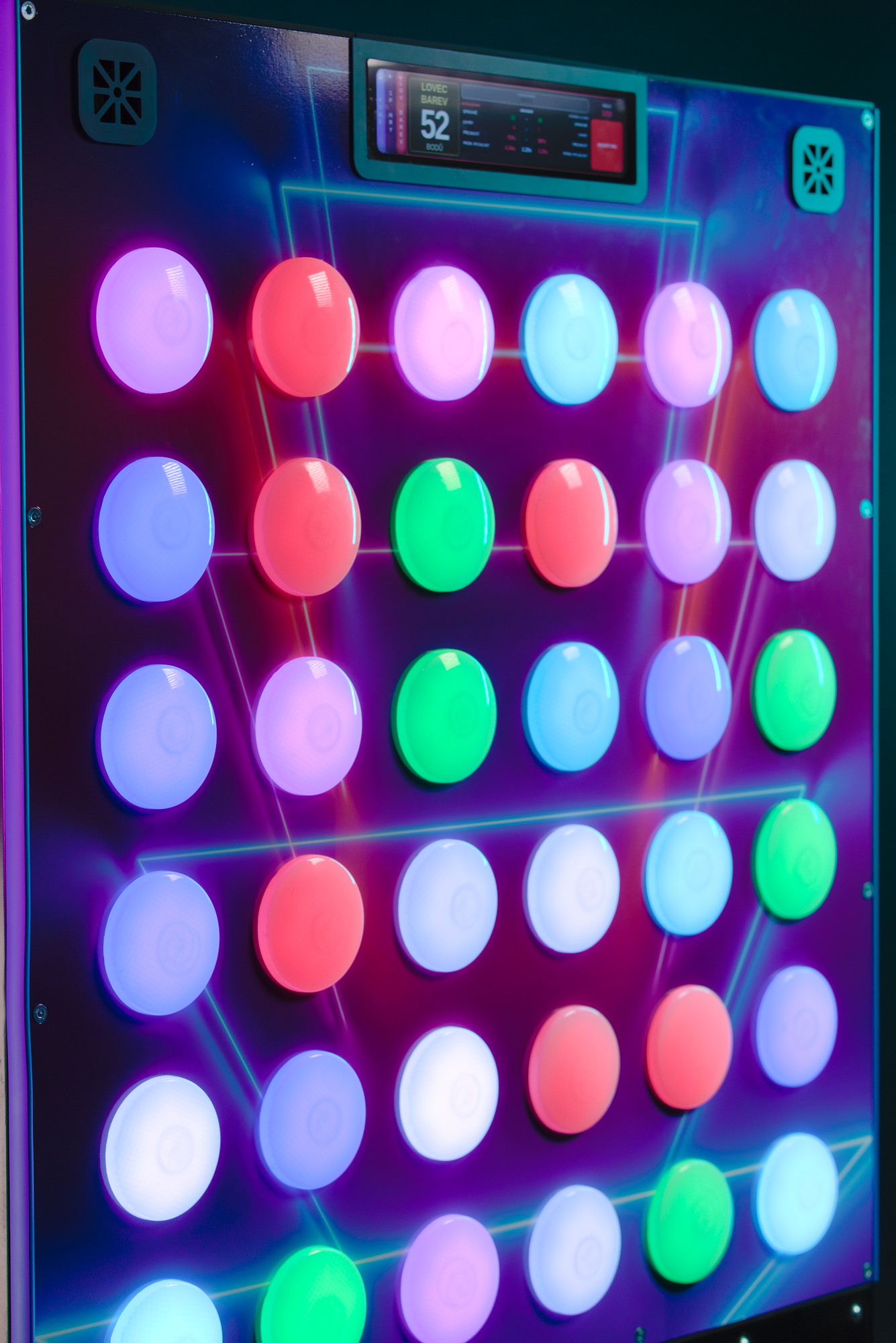 Herní prostředí je dynamické a interaktivní – tlačítka se mohou aktivovat náhodně nebo podle zvoleného herního režimu, což udržuje hru živou a nepředvídatelnou.